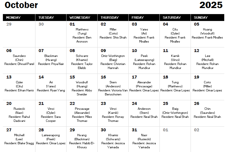 To reach the attending on call, you can reference the calendar below and page the attending directly. Alternatively, you can call the PCG clinic number 773-702-6840 and connect to the call center to have them page the PCG attending on call to your phone number.